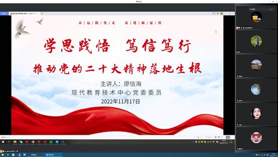 11月17日上午,为深入学习宣传贯彻党的二十大精神,根据疫情防控工作要求,第四党支部将党课搬上了“云端”。本次党课的主题为《学思践悟 笃信笃行 推动党的二十大精神落地生根》,由现代教育技术中心党委委员廖信海主讲,支部全体党员参加。